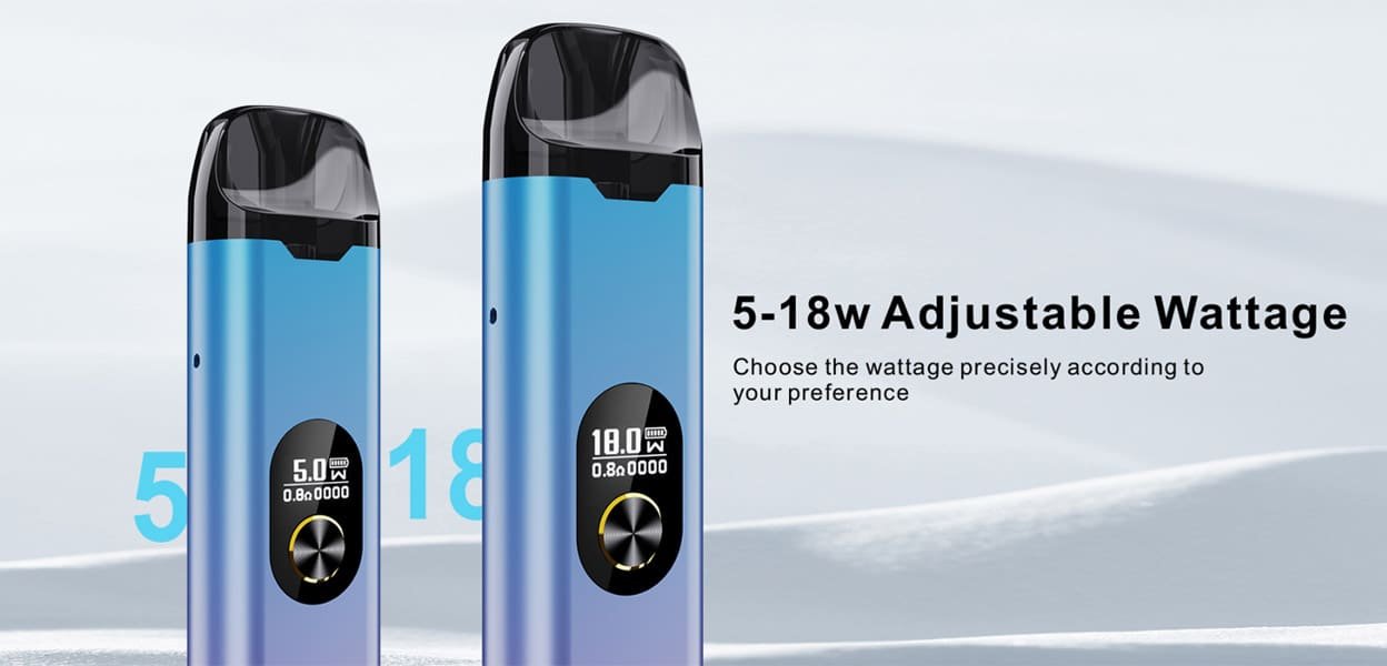 The EIR Pod Kit satisfies both MTL and RDL vapers by switching the pod around, accommodating a 2ml e-liquid capacity and ability to be refilled from the side hole. It holds an internal 800mAh built-in battery, and features 5-18W adjustable wattage option. The Type-C fast charging design means it can be fully charged in 40 minutes.